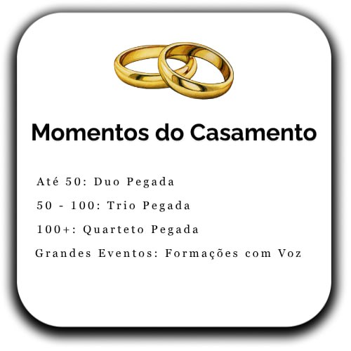 Trabalhamos com diversas formações musicais – desde combinações instrumentais mais clássicas até opções mais modernas e impactantes, com vozes e instrumentos variados. Tudo é pensado para criar a trilha sonora perfeita para o seu momento!